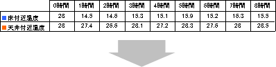 右のグラフは天井付近と床付近の温度を時間軸で表したものです。